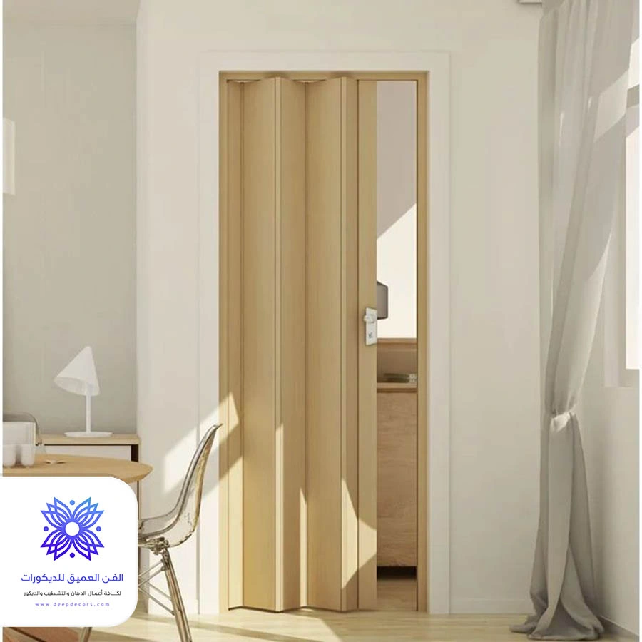 باب أكورديون PVC | بلاستيك مقاوم | الحمامات، المطابخ | مقاوم للرطوبة، سهل التنظيف، سعر مناسب | متوسط – عالي |
